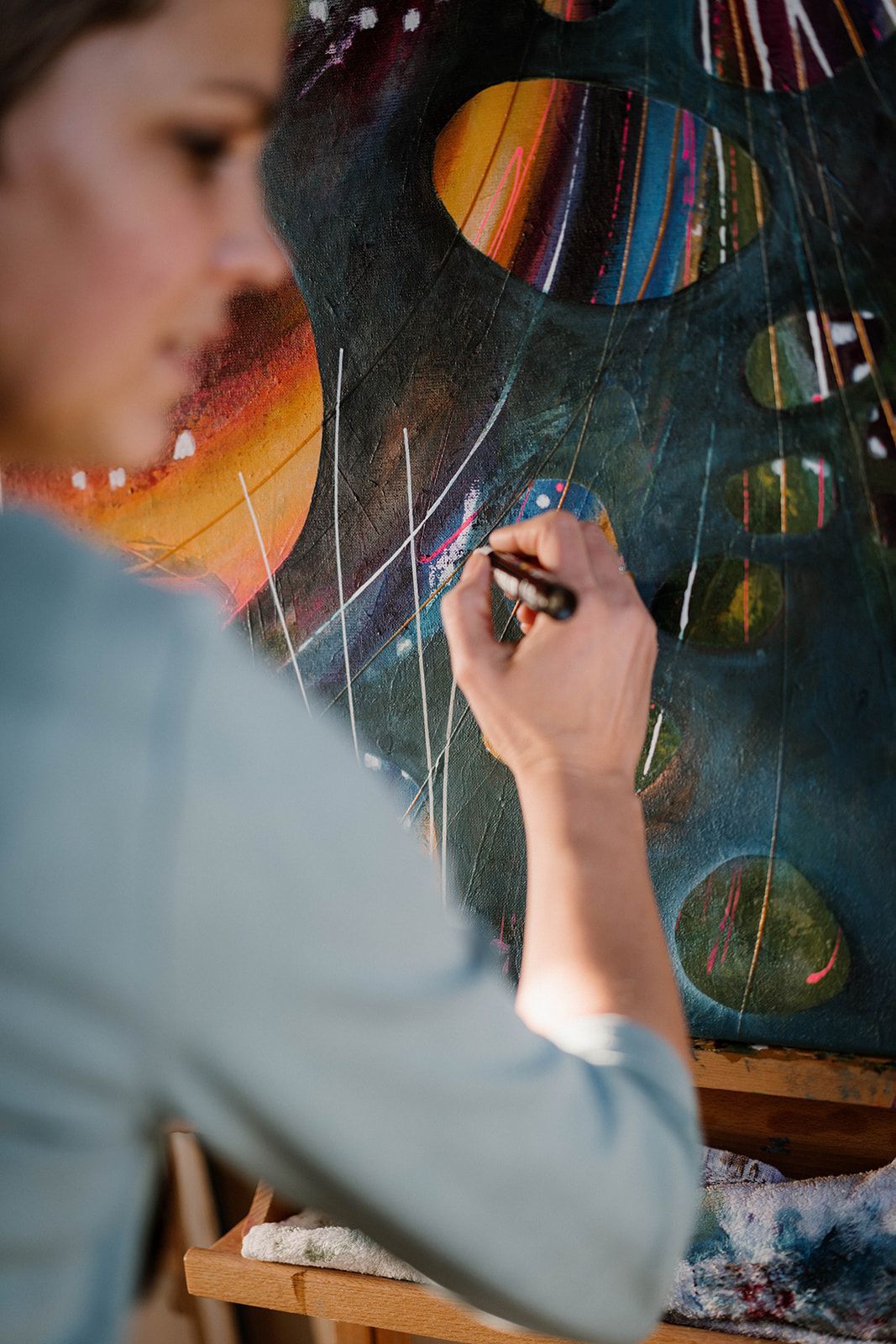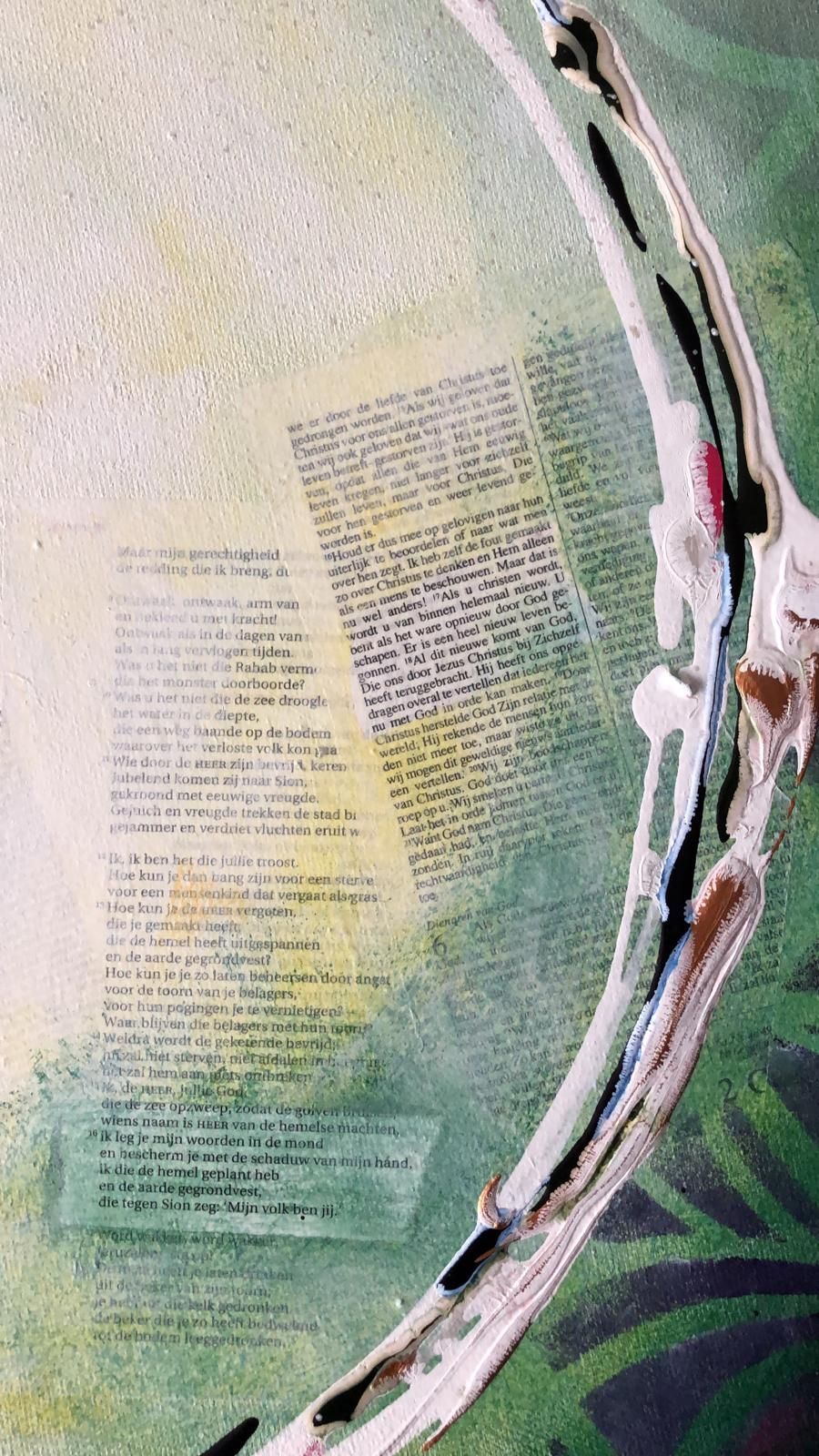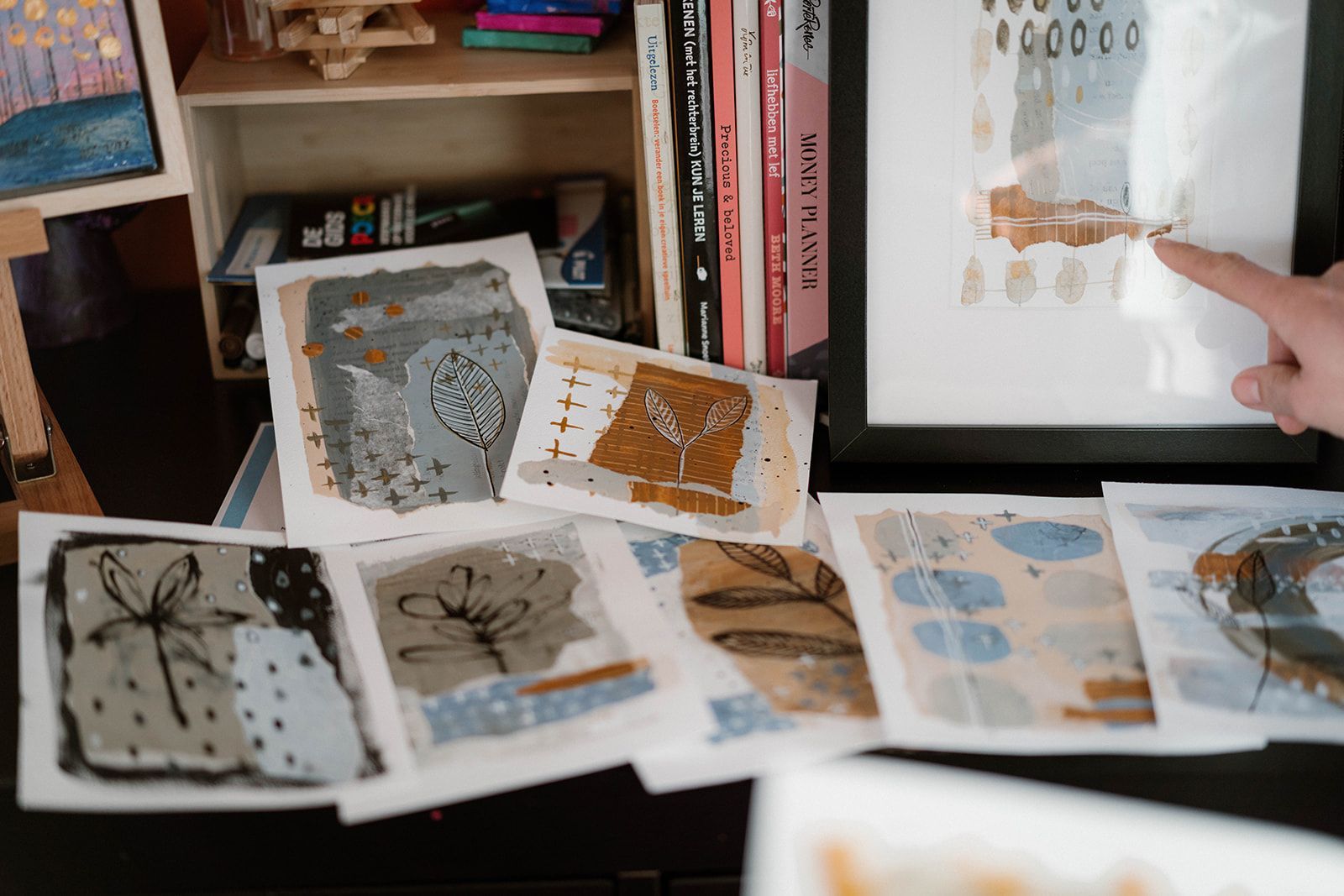Nu begint het creatieve proces! Met de input ga ik aan de slag. Ik neem de tijd om met de Bijbel open, in gebed en aanbidding op zoek te gaan naar de kern van het schilderij. Met kwast, paletmes, verf, bladgoud en allerlei materiaal ga ik voor jou aan de slag!