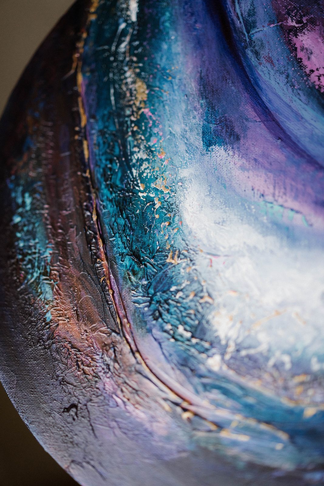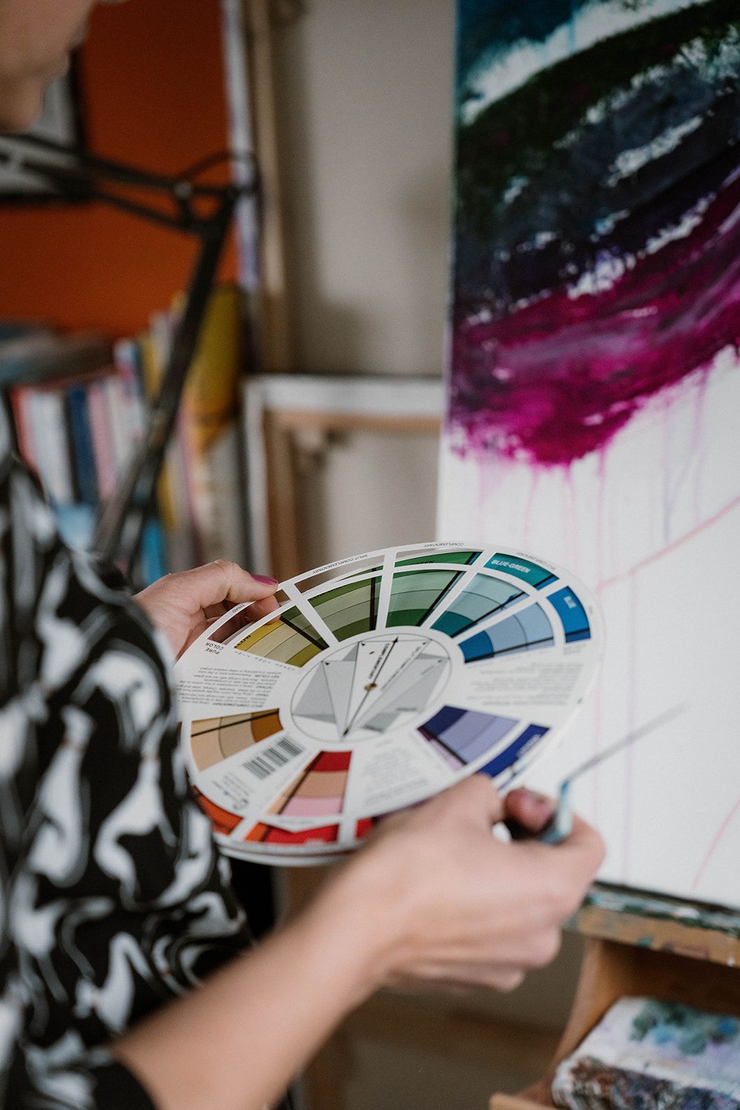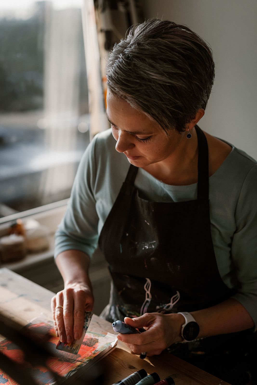 Nu begint het creatieve proces! Met de input ga ik aan de slag. Ik neem de tijd om met de Bijbel open, in gebed en aanbidding op zoek te gaan naar de kern van het schilderij. Met kwast, paletmes, verf, bladgoud en allerlei materiaal ga ik voor jou aan de slag!